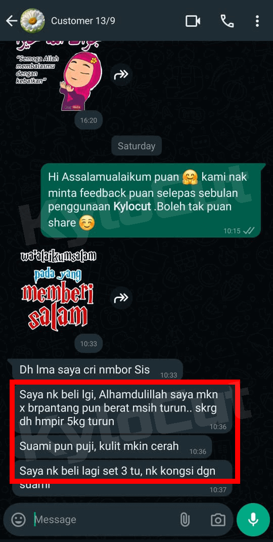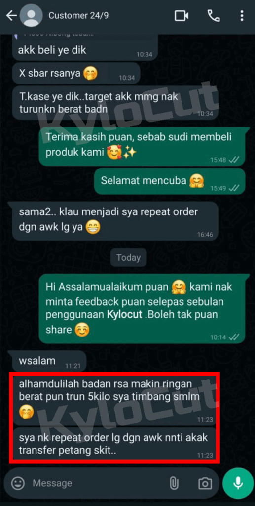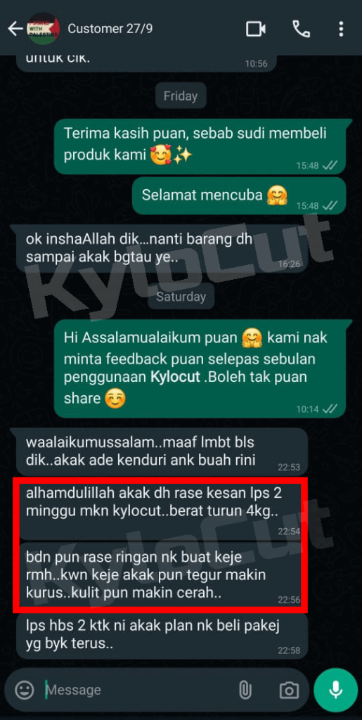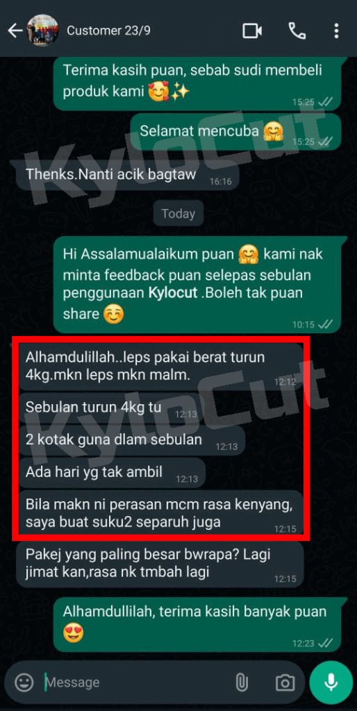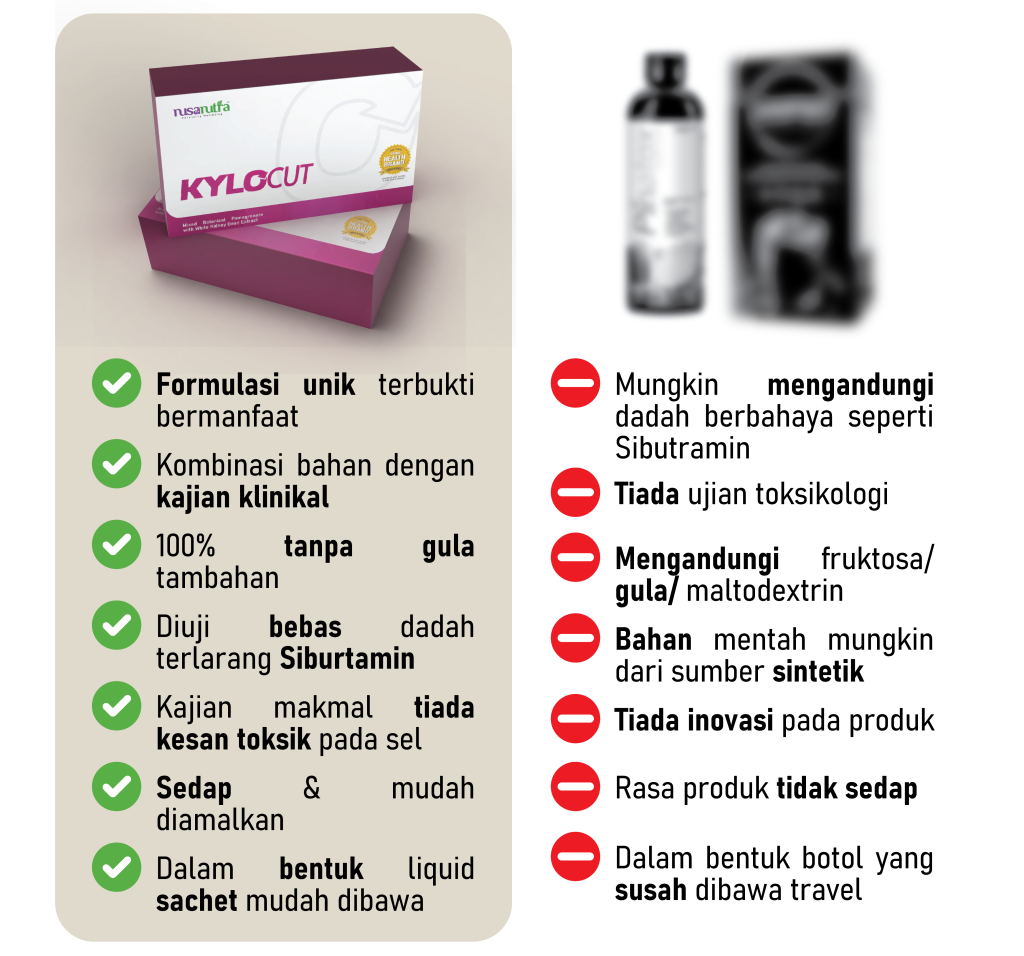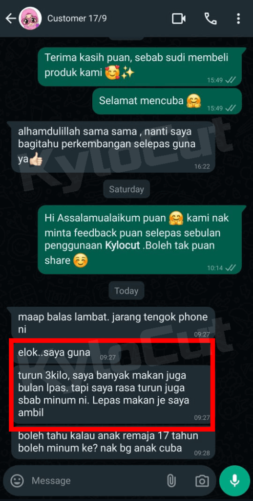 Sebab itu, kami bagi jaminan. Takda siapa pun akan rugi untuk cuba produk KYLOCUT. Cubalah produk ni sekarang. Sekiranya… selepas dah amalkan selama 3 bulan. Kalau tak suka dengan kesan. Rasa tak sedap. Tak suka kotak. Tak suka bau. Tak suka texture. Tak suka dengan apa jua sebab. Pulangkan balik.