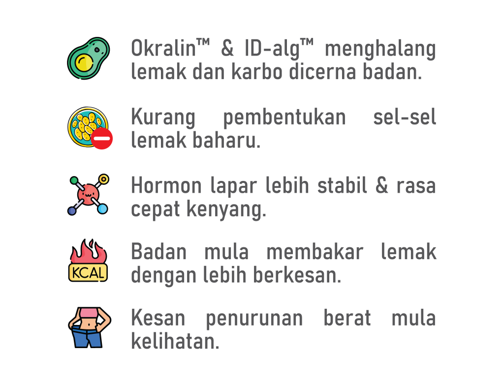 KYLOCUT menghalang penyerapan lemak dalam usus dan meningkatkan metabolisme lemak, menjadikan badan sistem pembakar kalori yang lebih efisien.