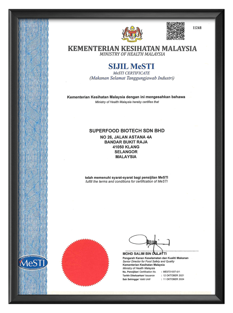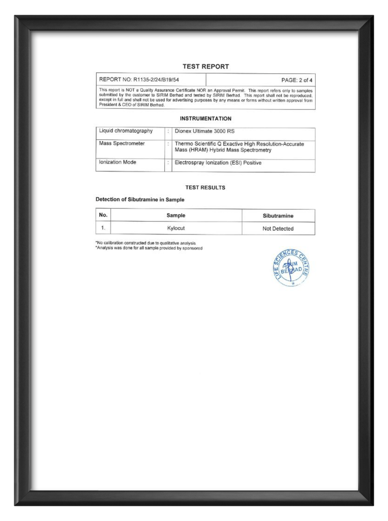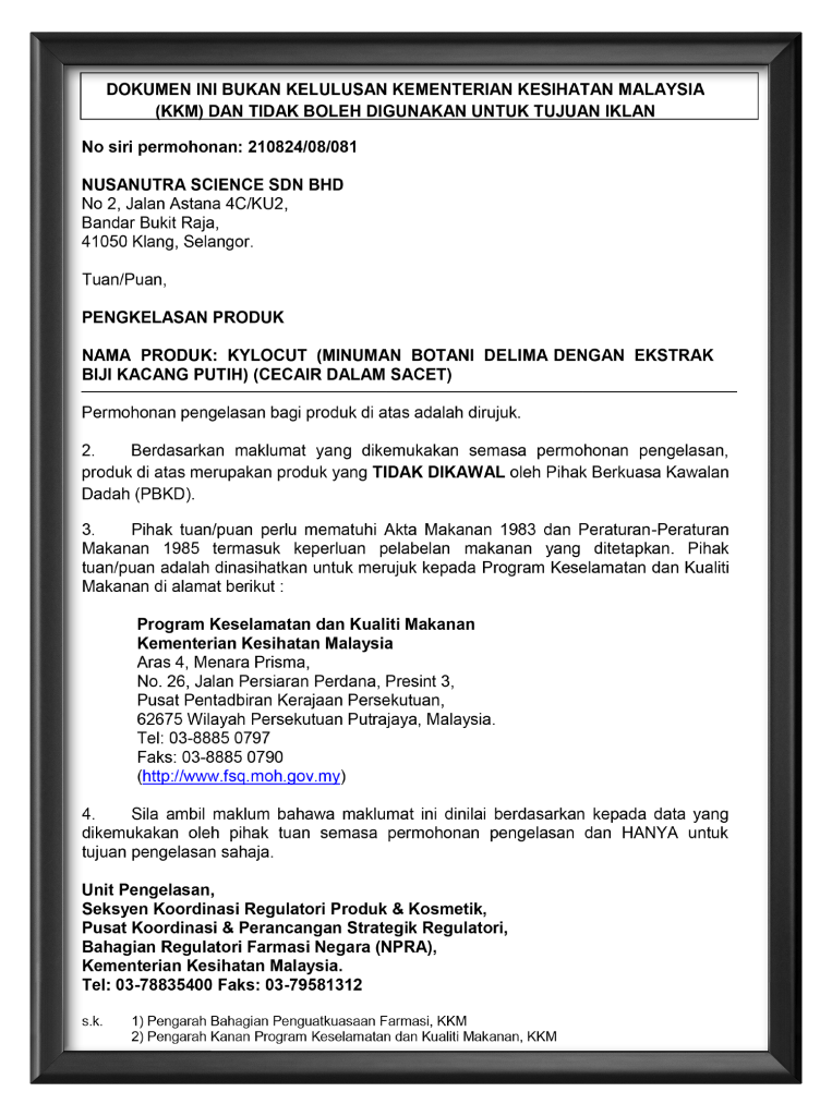Kylocut telah mendapat kelulusan daripada Kementerian Kesihatan dan disahkan dalam pengkelasan makanan tambahan