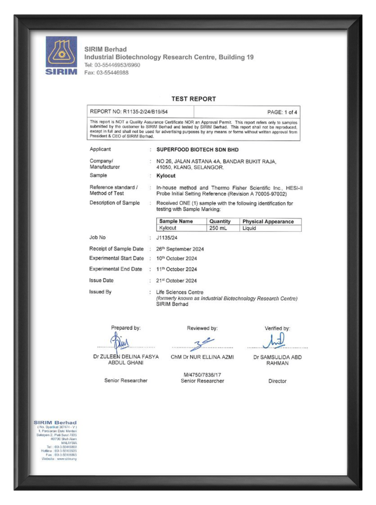 Paling penting, KYLOCUT™ telah diuji bebas toksik melalui kajian toksikologi, kajian logam berat dan bebas racun. Ia selamat untuk diamalkan.